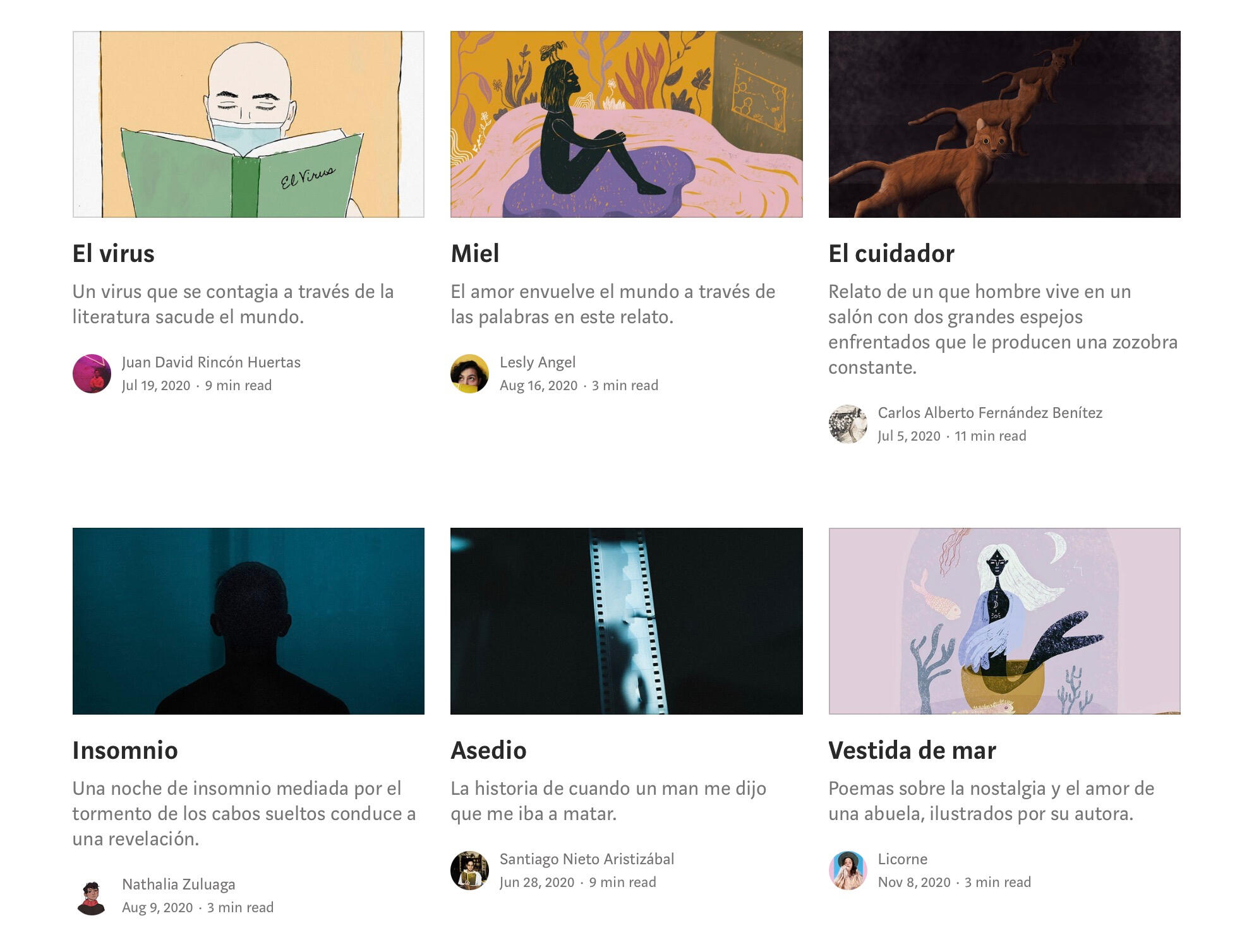 Cuento | Participación en el libro que recopila los textos ganadores del concurso «El Covid no es cuento» en la categoría «minificción», con el relato Agosto 2020. Concurso organizado por el Seminario de Literatura de la Universidad Icesi. Leer: Publicado por la Editorial Universidad Icesi.