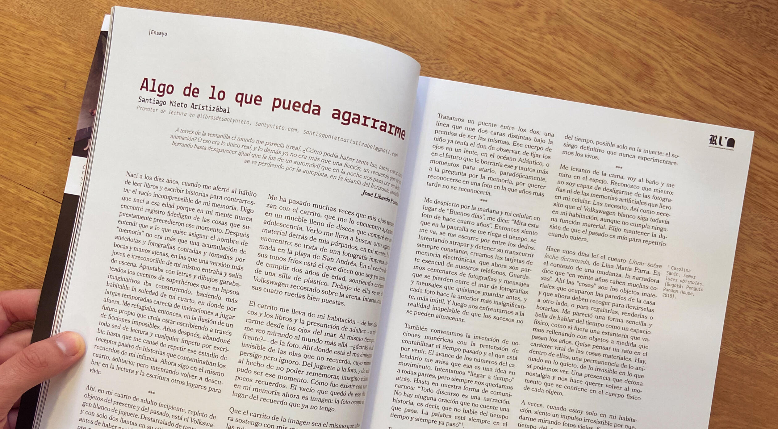 Ensayo | Del juguete a la foto, y de ahí al hecho de no poder rememorar, imagino cómo pudo ser ese momento. Cómo fue existir con tan pocos recuerdos. El vacío que quedó de ese día en mi memoria ahora es imagen: la foto ocupa el lugar del recuerdo que ya no tengo. Seguir leyendo: Publicado en el número 351 de la Revista Universidad de Antioquia.